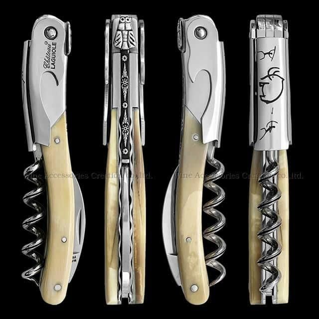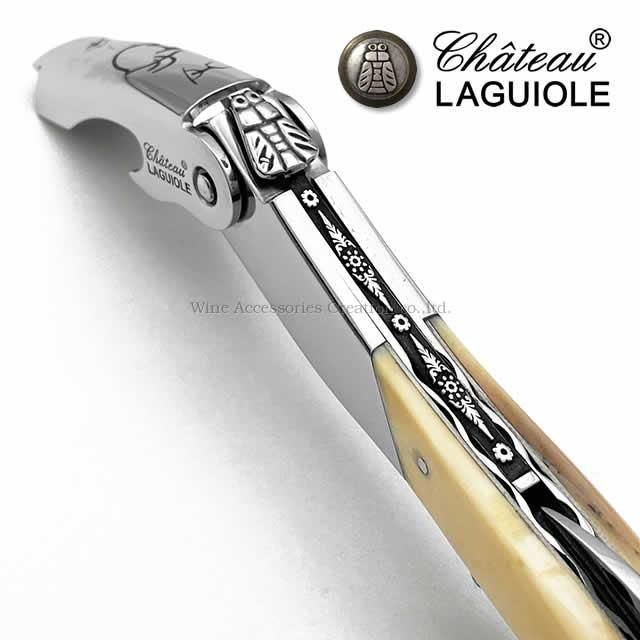 フランスの職人自身の技術やセンスを活かしてハンドル背部分に芸術的な彫刻をヤスリがけで施した、世界に1本の超希少なシャトーラギオール。フック(レバー)には古代壁画をモチーフにしたイラストの刻印が施されています。各モデルは熟練職人により全てフランスにて手作りで製作されています。正規保証なので、まさに一生ものの道具としてご愛用いただけます。